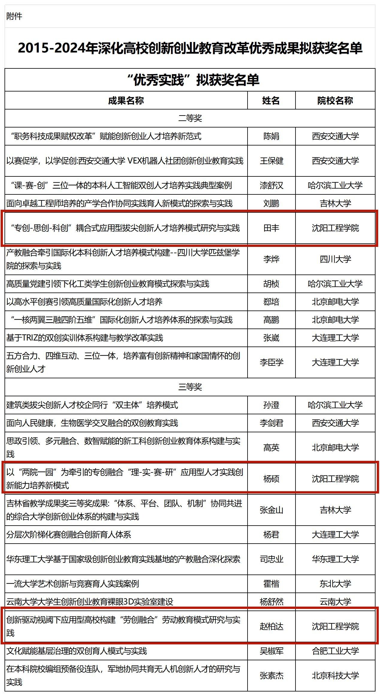 近日,由教育部指导的中国高校创新创业教育研究中心发布了“2015—2024年深化高校创新创业教育改革优秀成果获奖名单”,全国共有293项成果获奖,其中我校斩获全国二等奖1项,三等奖2项。