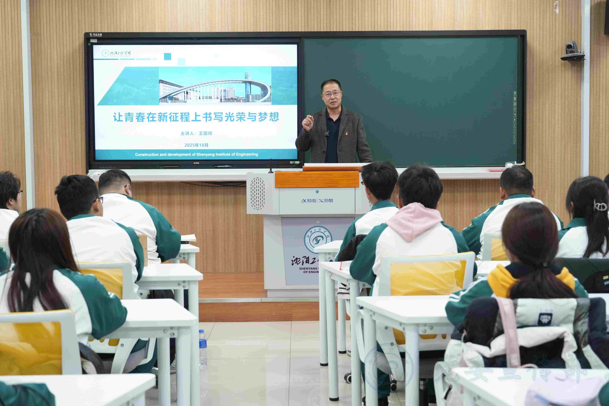 10月23日下午,校长王国辉在D218教室以“让青春在新征程上书写光荣与梦想”为题,为法学251、社工251两个班级的学生讲授了一堂生动的思政课。课程围绕争做沈工程精神的赓续者、又红又专又实的新传人、伟大复兴的追梦人三个方面,勉励青年学生在强国建设、民族复兴伟业中绽放青春光彩。