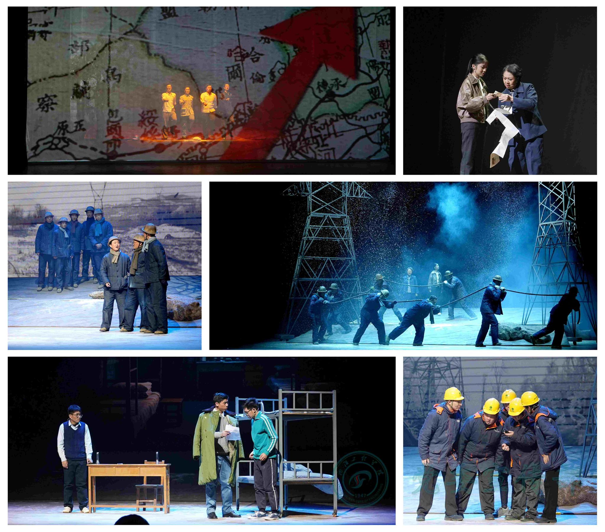 本次大赛学校选送的原创红色校史剧《根脉》,以同名书籍中沈工程校友的真实事迹为蓝本,借多时空叙事串联起电力人的热血长歌。剧目以“电力人代代坚守”为主线贯穿始终,以恢宏磅礴的叙事呈现了学校筚路蓝缕的创业历程,尾声依托“铁塔群像”的意象与掷地有声的誓言,将电力精神薪火相传的主题推向高潮,使跨越时空的精神力量直击心灵深处。作品从创作到排演历时四个月,全体演职人员始终保持对舞台艺术最赤诚的精神信仰和最热烈的精神追求,为《根脉》注入了青春动能和澎湃激情,最终为评委与观众带来振奋人心、气势壮美的艺术体验。台下的掌声经久不息,观众为校史剧中所呈现出的电力人的坚守与担当震撼不已。