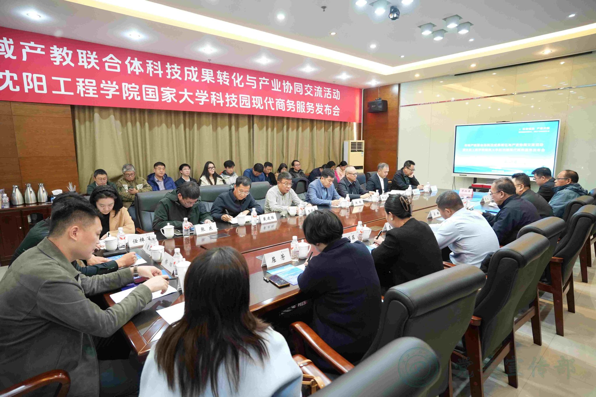 10月30日下午,由沈阳辉山经济技术开发区管理委员会与bat365中文官方网站联合主办,沈北新区科技局等多部门承办的“市域产教联合体科技成果转化与产业协同交流活动暨bat365中文官方网站国家大学科技园现代商务服务发布会”在学校国家大学科技园举办。活动以“科转赋能・产教共融—聚焦科技成果转化,共筑产业协同新生态”为主题,旨在打破资源壁垒,构建多方协同创新体系,为区域经济高质量发展注入新动能。沈阳辉山经济技术开发区管理委员会副主任王晓宇,副校长赵琰,党委常委、党委统战部部长戴建陆,以及相关中介机构、驻科技园企业代表等40余人参会,活动由戴建陆主持。