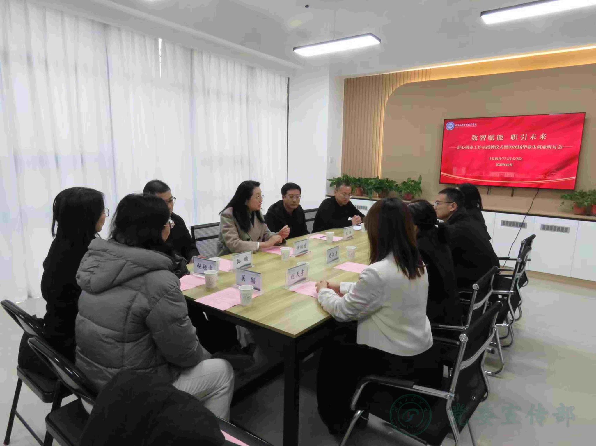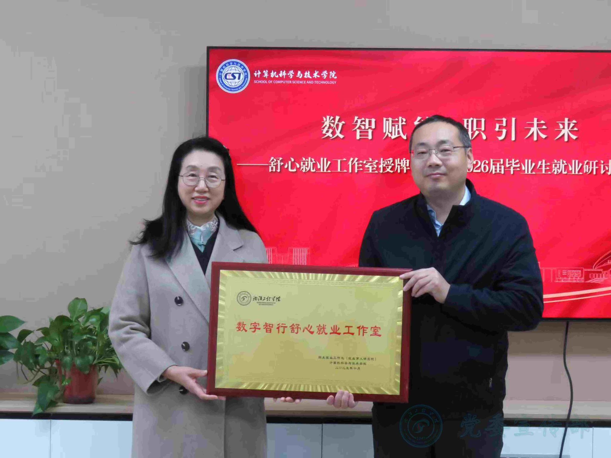 10月30日下午,学校“数字智行”舒心就业工作室授牌仪式暨2026届毕业生就业研讨会在F座111会议室举行。党委副书记方鸿志出席活动并为计算机科学与技术学院“数字智行”舒心就业工作室授牌。招生就业工作处、计算机科学与技术学院相关负责人参加活动。