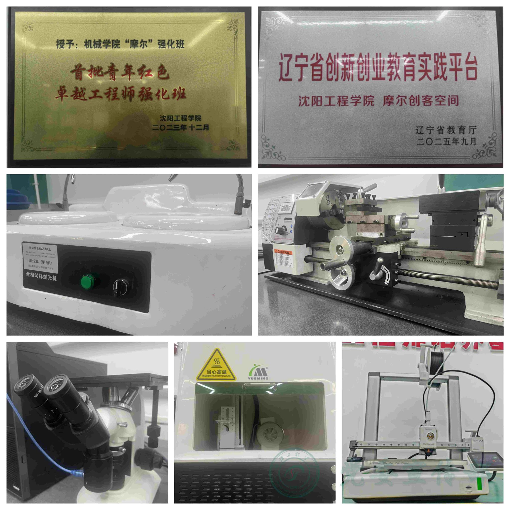 “摩尔”青年红色卓越工程师强化班依托“摩尔”创客空间(新型电力系统实训大楼319室),为师生搭建课外实践平台。经过多年积累,目前拥有数控雕刻机、3D打印机、激光切割机、小型车床、镭雕机、机械手和探索者机器人系统等各类硬件设备40多台套,校企共同投入资金,总值近200万元人民币,于2025年9月获评辽宁省创新创业教育平台。联合沈阳摩尔创客教育研究院有限公司双创基地、沈阳多元机电有限公司双创实践基地、沈阳纽科利科技公司创意实践基地、沈阳航空制造有限公司创造实践基地、沈阳大陆激光创新研发基地,打造了超过3600平方米双创校外实践基地,开展项目式教学、企业课题研发及学科竞赛,实现“课堂—企业—科研”三位一体培养模式。学生通过参与企业技术攻关、顶岗实践及校内竞赛,综合能力显著提升。