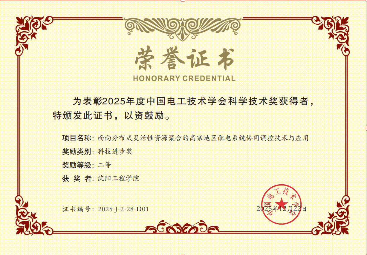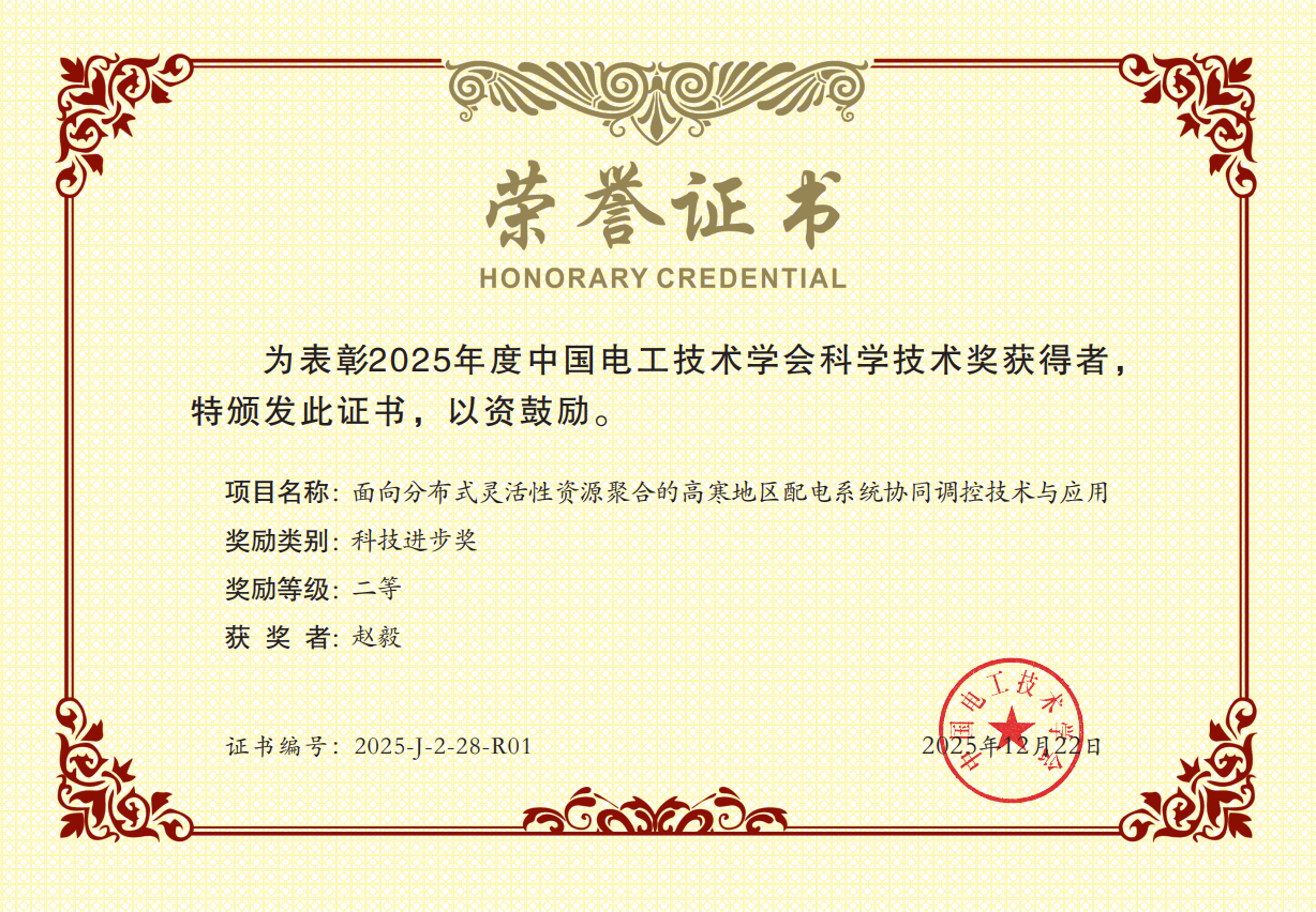 近日,中国电工技术学会正式公布2025年度科学技术奖评选结果,学校赵毅教授团队牵头完成的“面向分布式灵活性资源聚合的高寒地区配电系统协同调控技术与应用”研究成果,凭借突出的技术创新与显著的应用价值,荣获科技进步奖二等奖,这一殊荣标志着学校在配电系统领域的研究达到国内先进水平,实现重大突破。