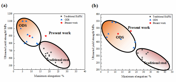 图2 层状晶粒结构CLAM钢室温(a)和600℃(b)屈服强度和最大延伸率与传统等轴RAFM钢和ODS钢对比。