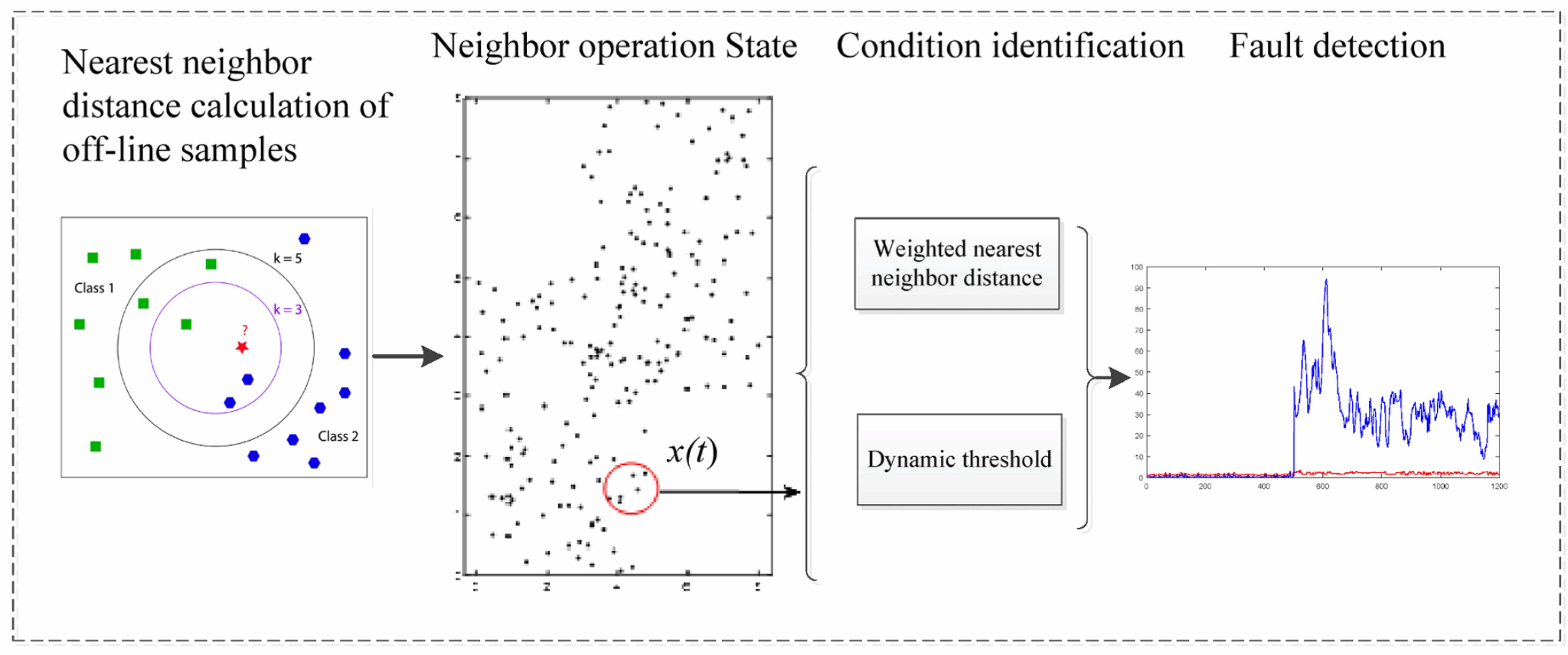 钱小毅博士为解决风电机组关键组件运行工况复杂多变和多维监测特征存在的多维动态关联性而造成故障检测精度不理想的问题,提出了一种基于时空特征和邻域运行状态的风电机组故障检测方法(图1),构建了一种基于互信息积累的时空特征提取方法来描述离线阶段多维特征之间的动态相关性,利用时空特征建立加权k近邻故障检测模型。在线阶段,利用在线样本与离线相似运行状态的加权距离来识别异常状态。此外,他设计了基于近似样本的动态阈值,以应对多变的工况。通过SCADA系统中的故障记录对该方法进行了验证(图2),结果表明提出的时空特征提取方法能更好地描述风电机组的运行特征,动态阈值能显著降低故障检测过程的误报率。