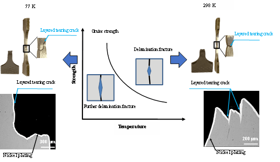 本课题组前期的研究表明层状结构可以有效提高CLAM钢的室温和873K下的强塑性(https://doi.org/10.1016/j.ijplas.2023.103813),本次研究成果为该成果的延续。研究表明,当温度降低至77K时,由于晶内强度的增加,拉伸条件下层状CLAM钢中产生的纵向撕裂会显著增加,从而进一步增加塑性变形区域,弥补钢在低温条件下塑性变形能力的降低,进而抑制CLAM钢的低温拉伸脆性。我们认为该层状晶粒结构同样适用于其他BCC结构的金属和合金,从而可以将其使用范围扩展到低温领域。