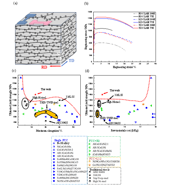 图2 层状晶粒结构CLAM钢的拉伸性能(a)取样方向,(b)77K和298K条件下层状结构与等轴结构CLAM钢的拉伸性能对比,(c)层状结构CLAM钢与目前常用低温合金的77K强塑性和(d)原材料成本对比