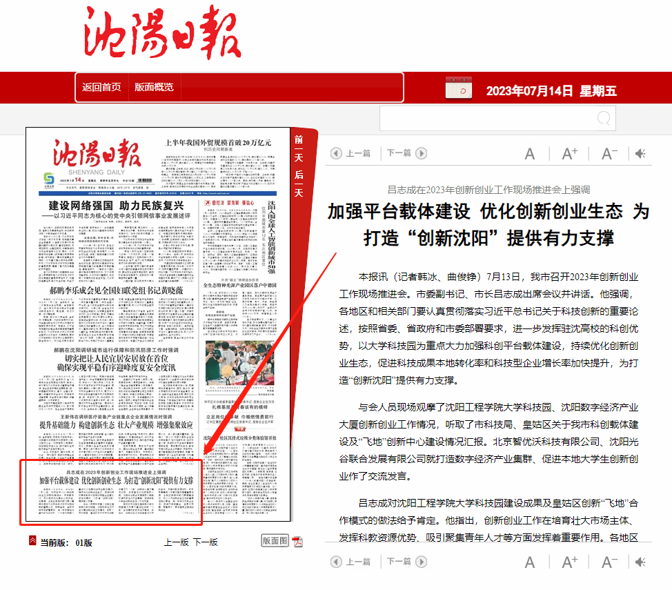 编者按:7月14日,《沈阳日报》以“加强平台载体建设 优化创新创业生态 为打造‘创新沈阳’提供有力支撑”为题,就进一步发挥驻沈高校的科创优势,以大学科技园为重点大力加强科创平台载体建设,持续优化创新创业生态,促进科技成果本地转化率和科技型企业增长率加快提升,为打造“创新沈阳”提供有力支撑进行报道,现将报道全文转载如下: