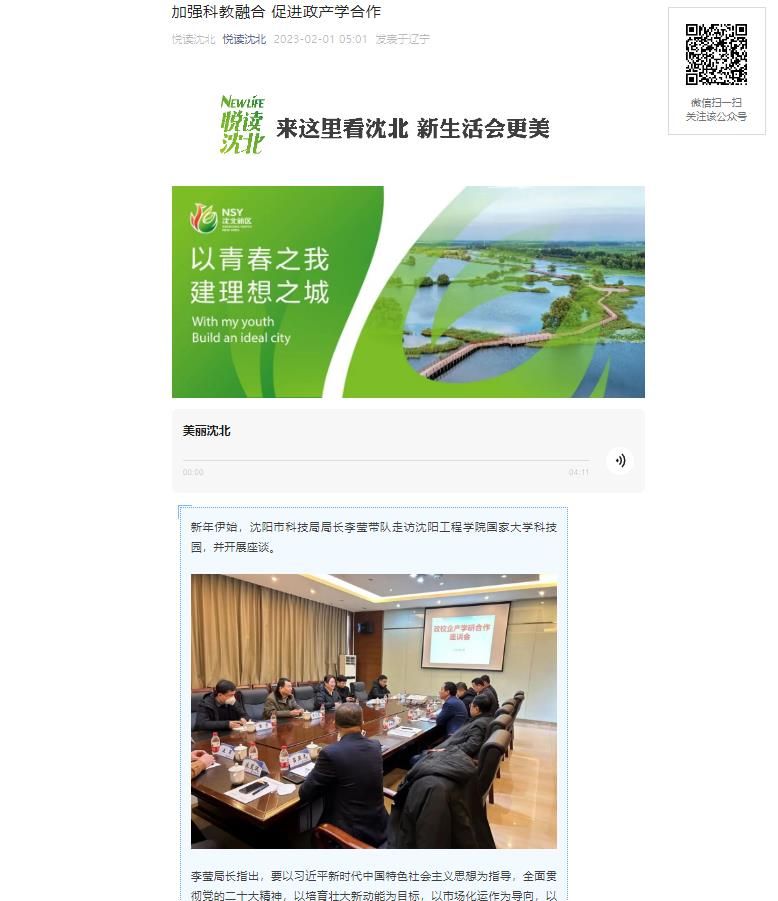 编者按:2月1日,沈北新区官方微信以“加强科教融合 促进政产学合作”为题,就新年伊始,沈阳市科技局局长李莹带队走访我校国家大学科技园并开展座谈一事进行了专题报道。现将报道原文转载如下: