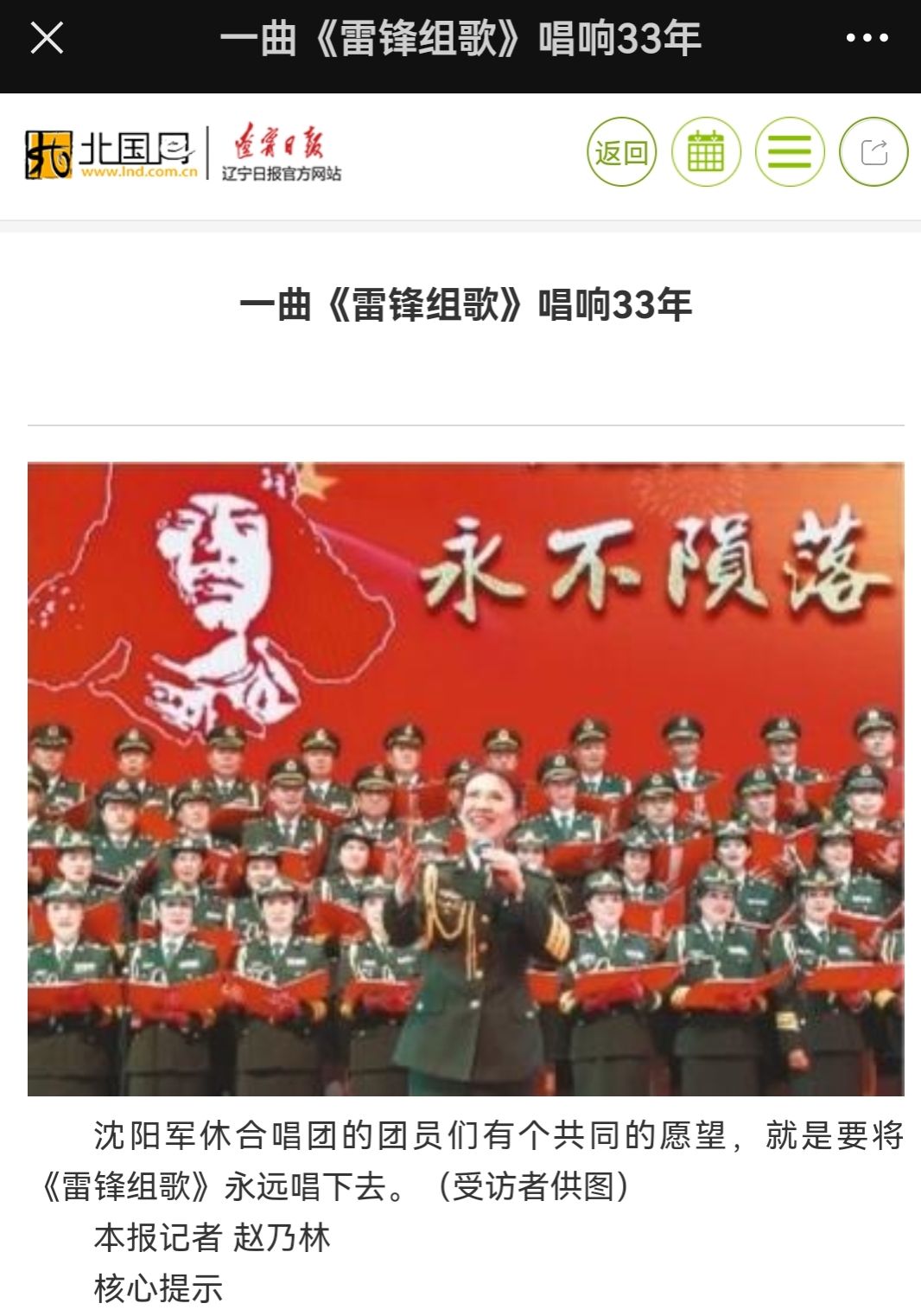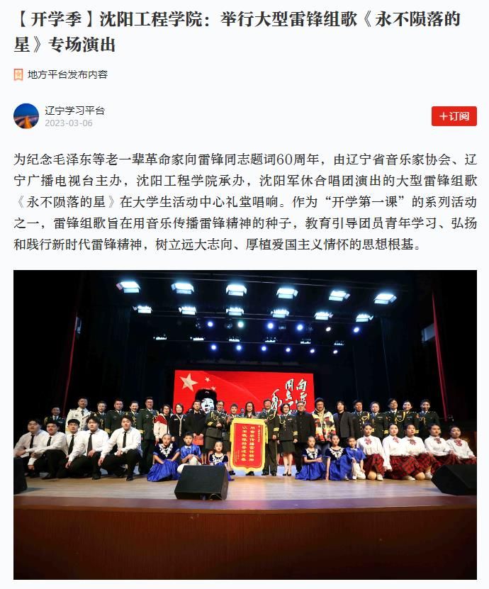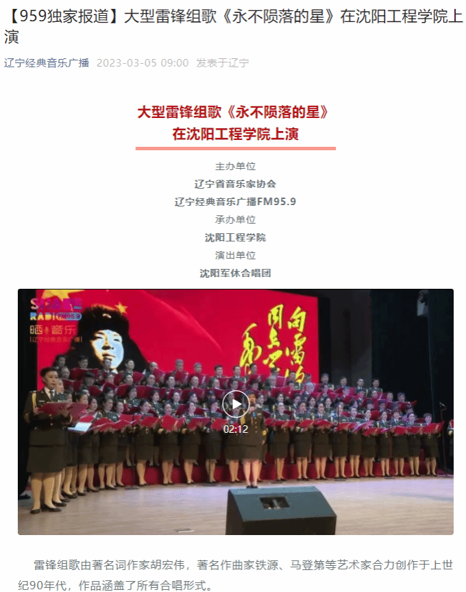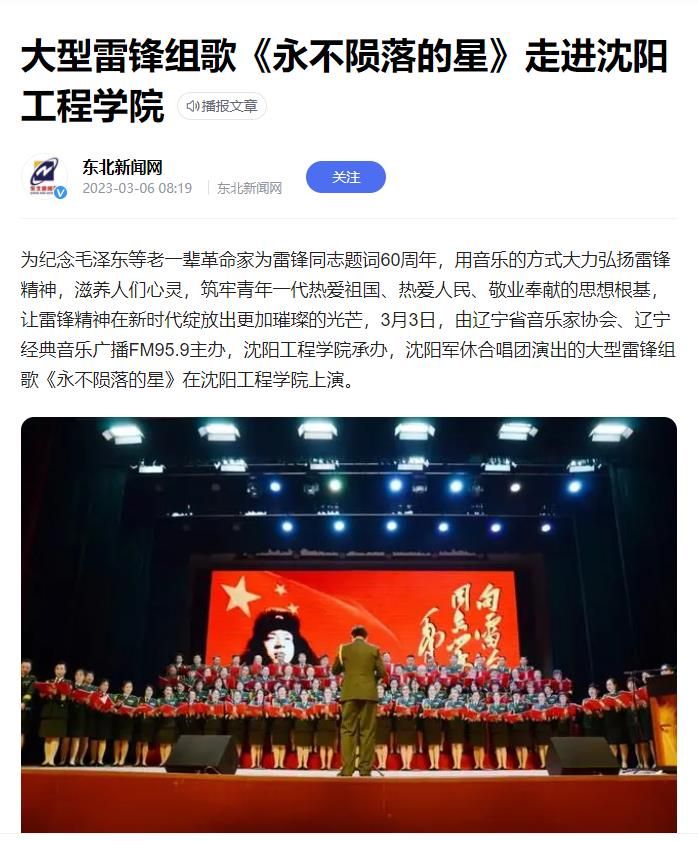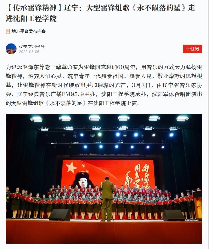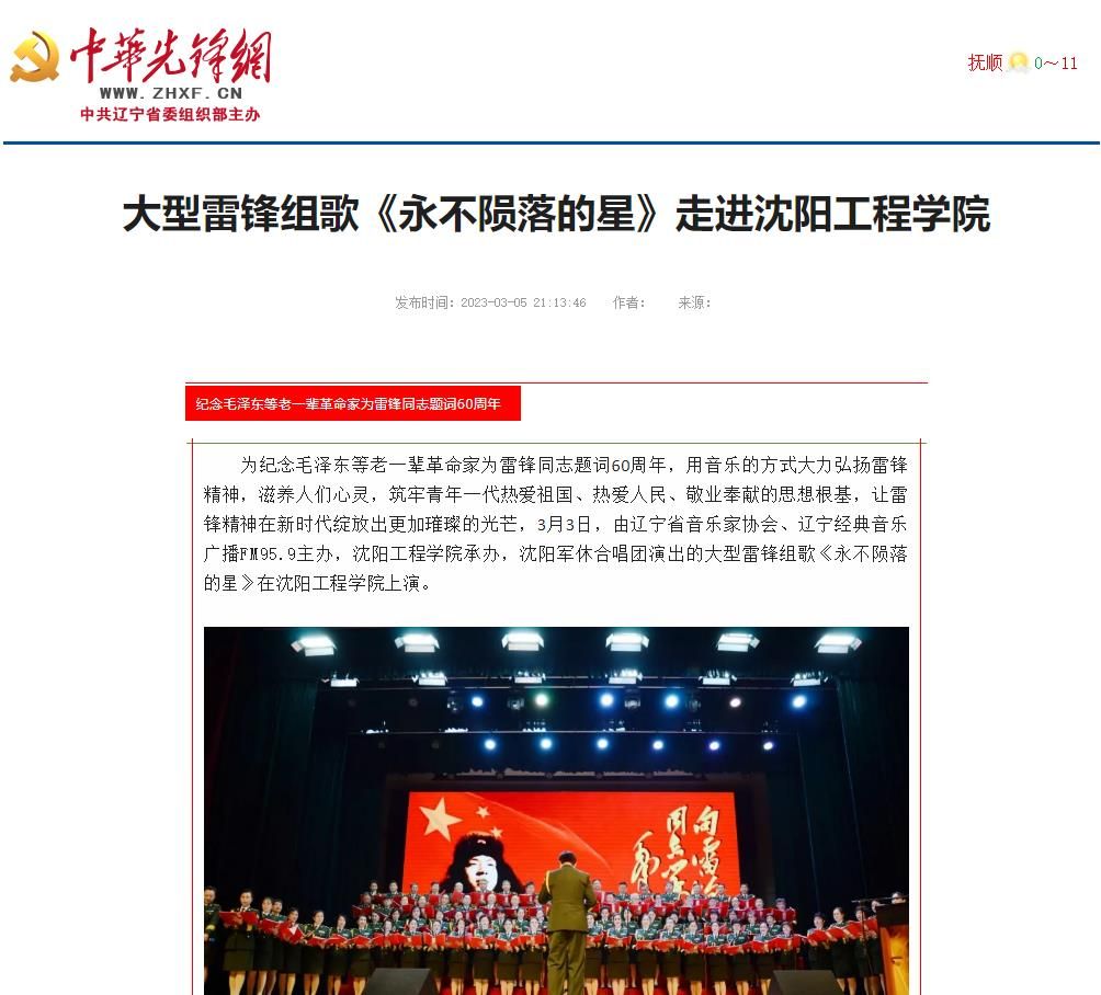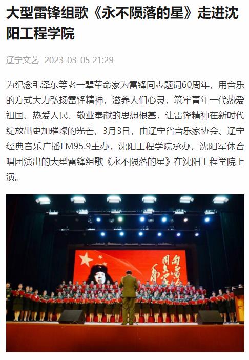 编者按:3月5日、6日,辽宁日报、中华先锋网、学习强国辽宁学习平台、东北新闻网、北国网、辽宁经典音乐广播、辽宁文艺等多家主流媒体,纷纷就我校举行大型雷锋组歌《永不陨落的星》专场演出进行专题报道。现将报道原文转载如下: