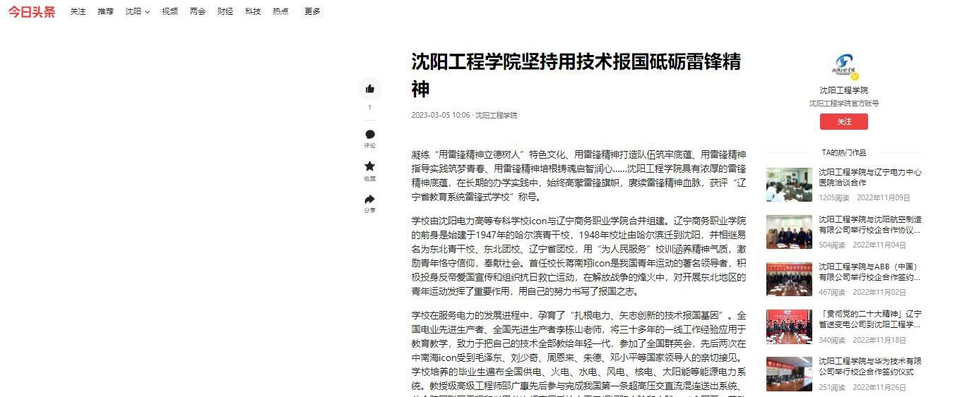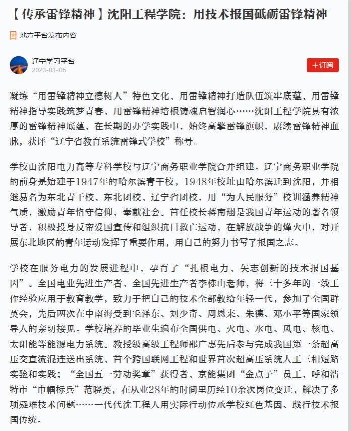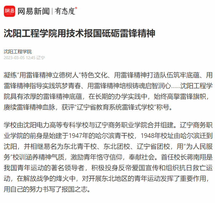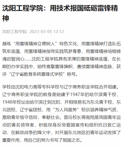编者按:3月5日、6日,学习强国辽宁学习平台、今日头条、网易新闻以及北国网等多家主流媒体以“bat365中文官方网站用技术报国砥砺雷锋精神”为题,就我校近年来凝练了“用雷锋精神立德树人”特色文化、用雷锋精神打造队伍筑牢底蕴、用雷锋精神指导实践筑梦青春、用雷锋精神培根铸魂启智润心,在长期的办学实践中始终高擎雷锋旗帜,赓续雷锋精神血脉一事进行了专题报道。现将报道原文转载如下: