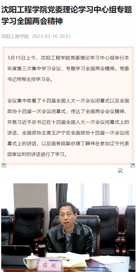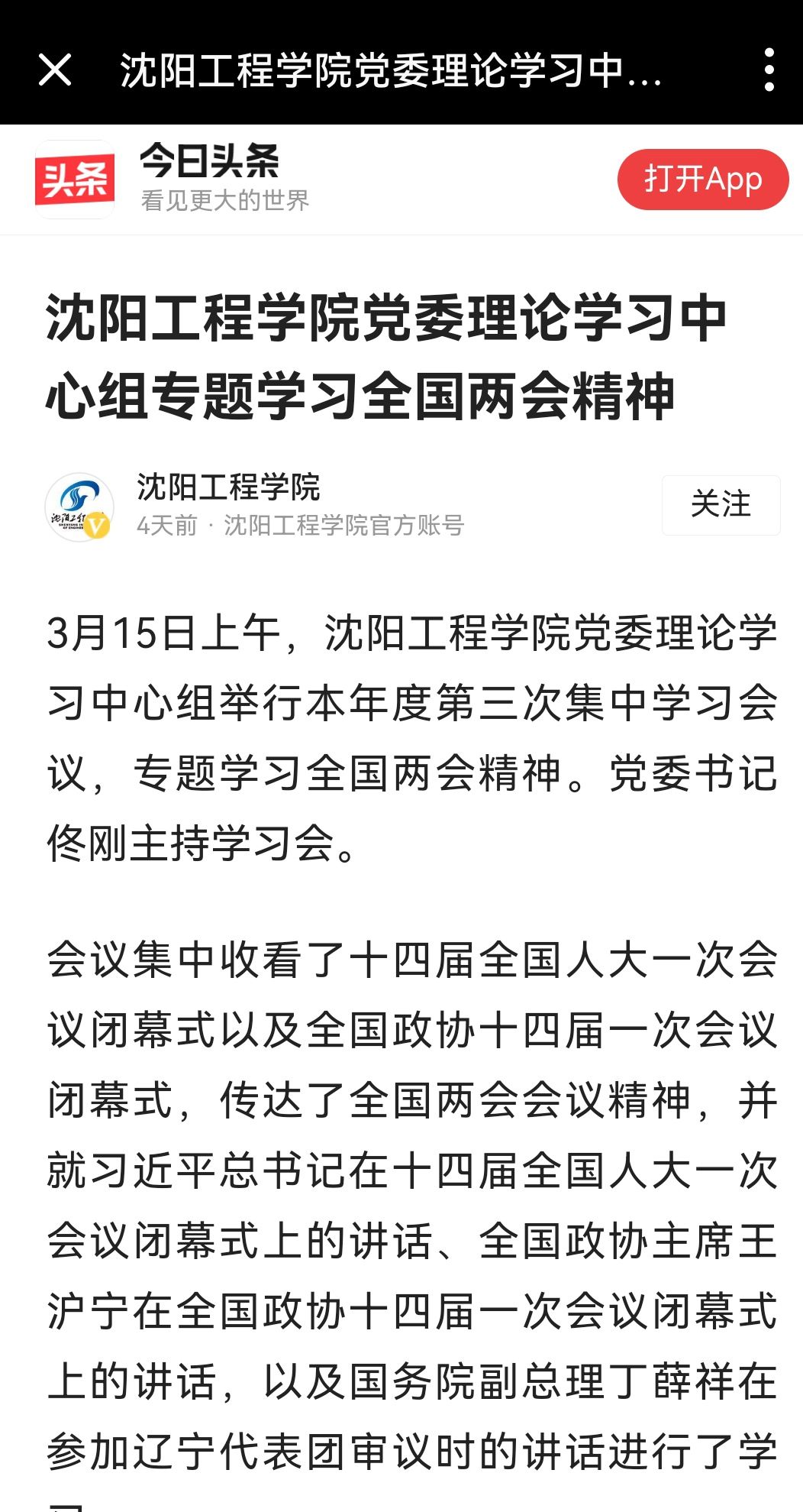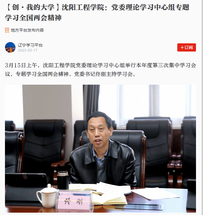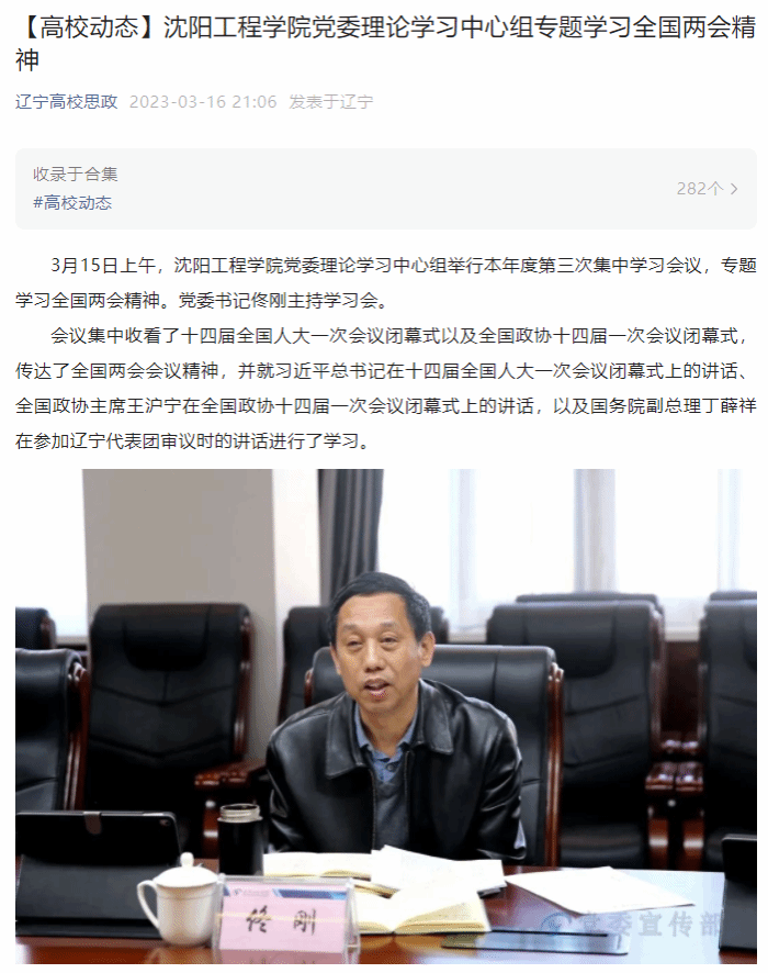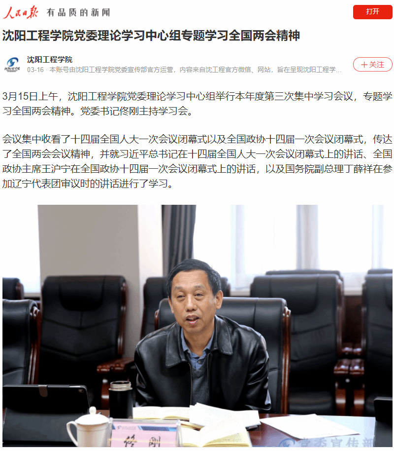 编者按:3月16日、17日,人民日报、学习强国辽宁平台、辽宁高校思政、北国网以及今日头条等主流媒体,纷纷就我校党委理论学习中心组专题学习全国两会精神,党委书记佟刚主持学习会并发表讲话一事进行专题报道。现将报道原文转载如下: