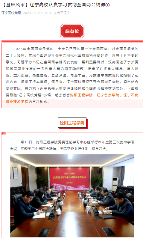编者按:3月29日,辽宁高校党建以“【基层风采】辽宁高校认真学习贯彻全国两会精神①”为题,就包括我校在内的3家省属高校组织召开专题学习会议,紧密结合自身实际,着力把习近平总书记重要讲话精神和全国两会精神落到实处进行专题报道。现将报道原文转载如下: