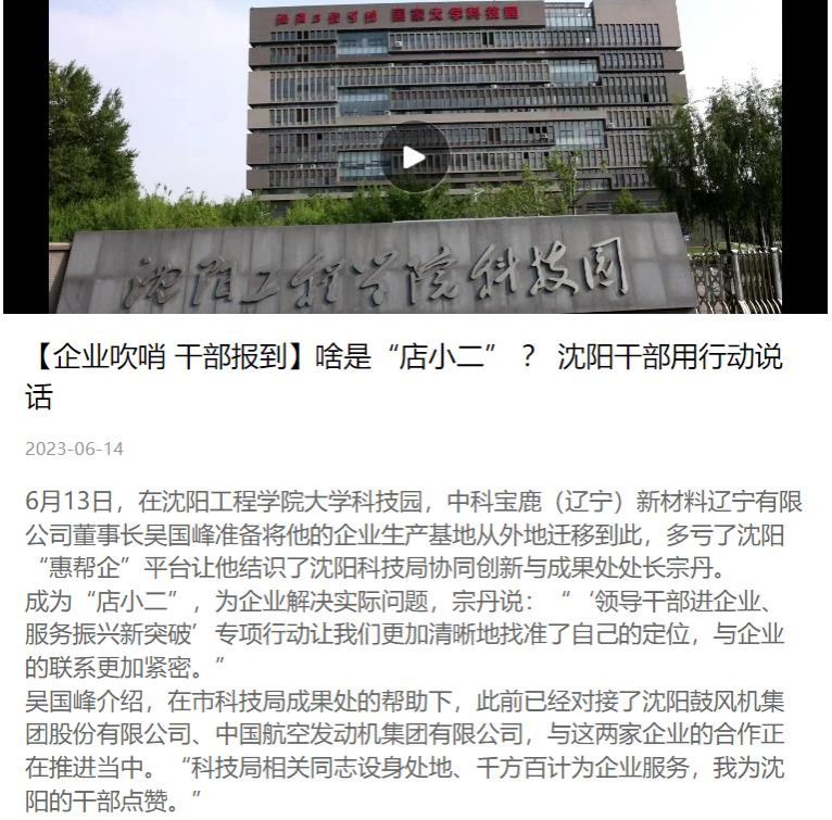 编者按:6月14日,沈阳发布以“【企业吹哨 干部报到】啥是“店小二” ? 沈阳干部用行动说话”为题,就沈阳市科技局干部从企业需求和产业需求出发,做好服务,当好“店小二”,提升科技成果本地转化率和产业化率进行报道,我校大学科技园凭借硬实力吸引企业进驻一事赢得了广泛关注。现将报道原文转载如下: