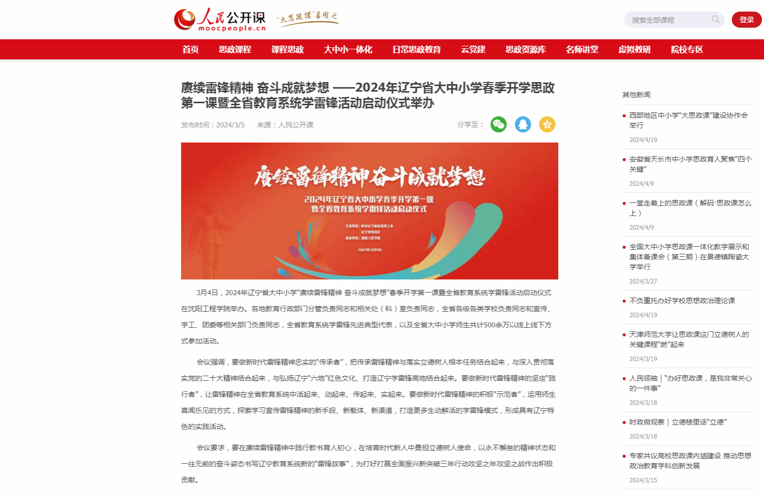 多家主流媒体:2024年辽宁省大中小学春季开学第一课暨全省教育系统学雷锋活动启动仪式在bat365中文官方网站举办