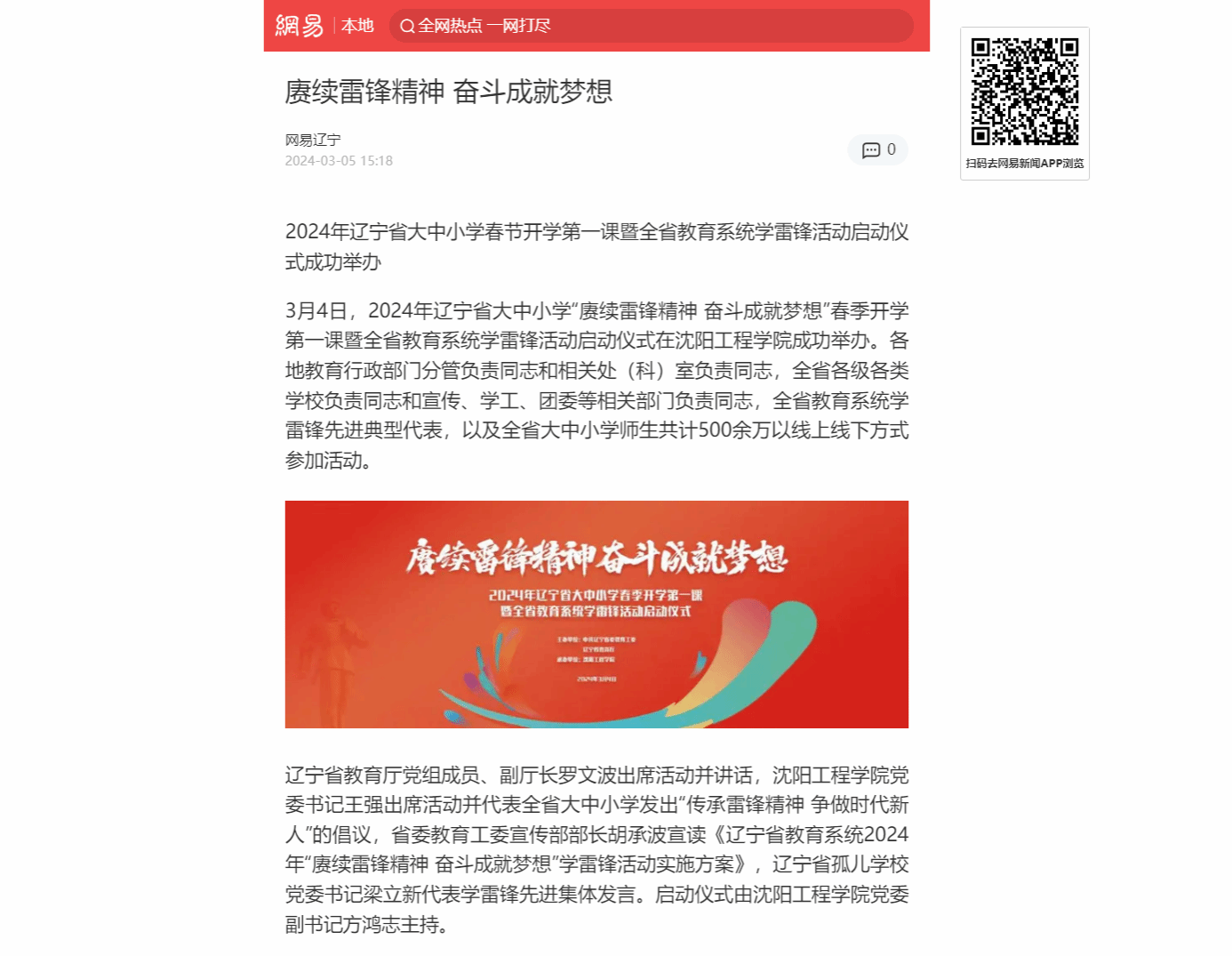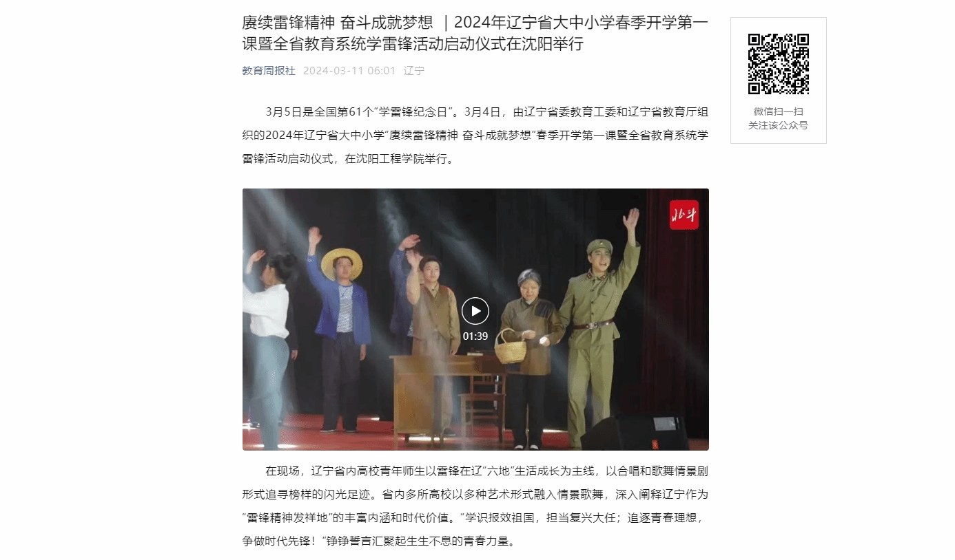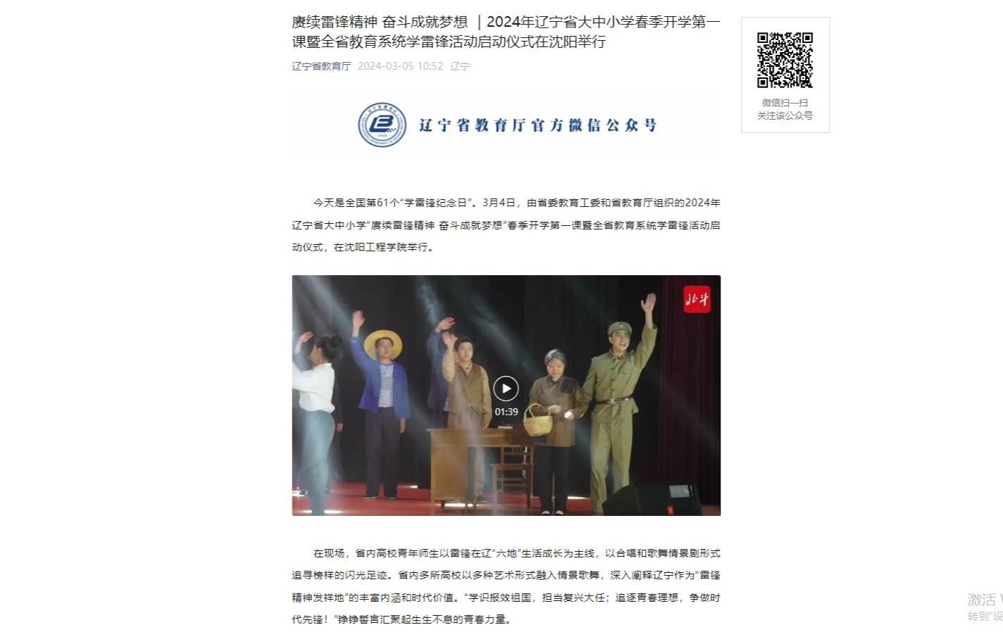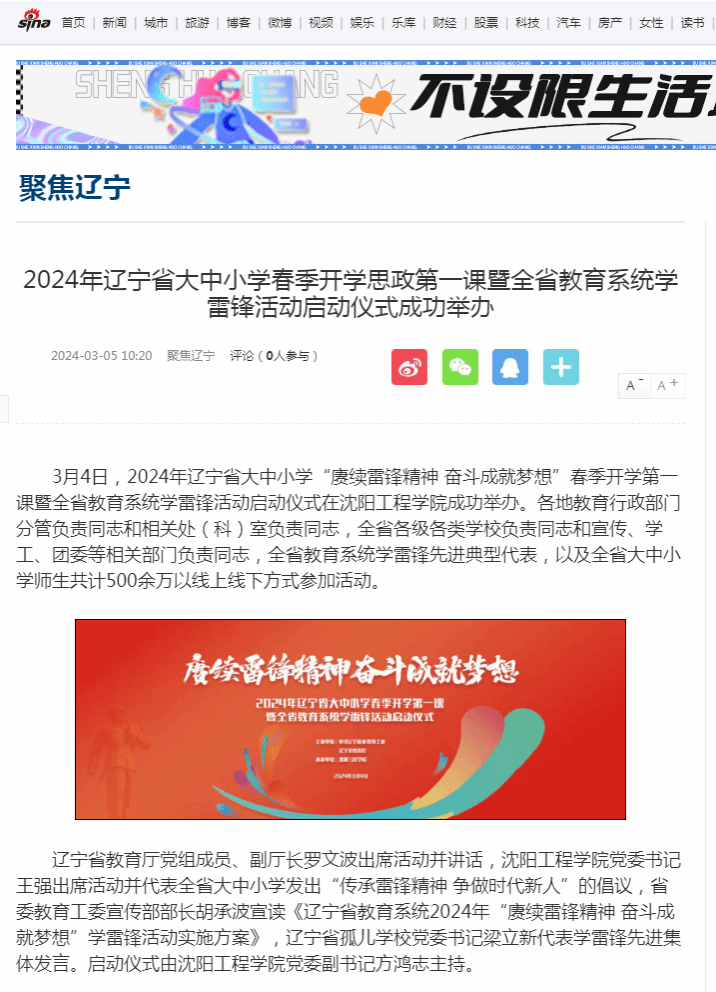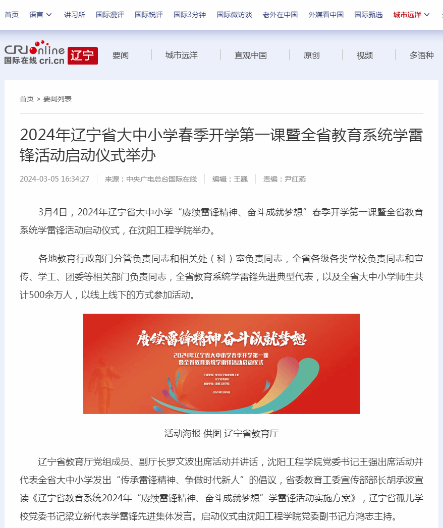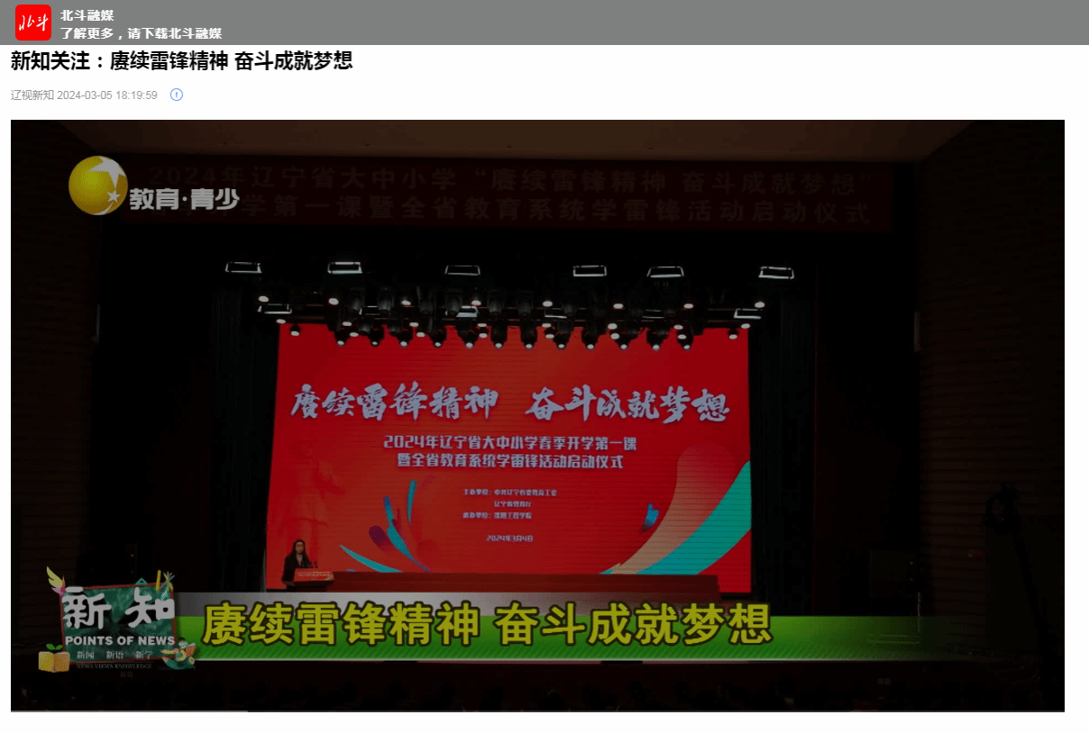 编者按:近日,多家主流媒体以“2024年辽宁省大中小学春季开学第一课暨全省教育系统学雷锋活动启动仪式在bat365中文官方网站举办”为题进行报道及转载。现将相关报道转载如下: