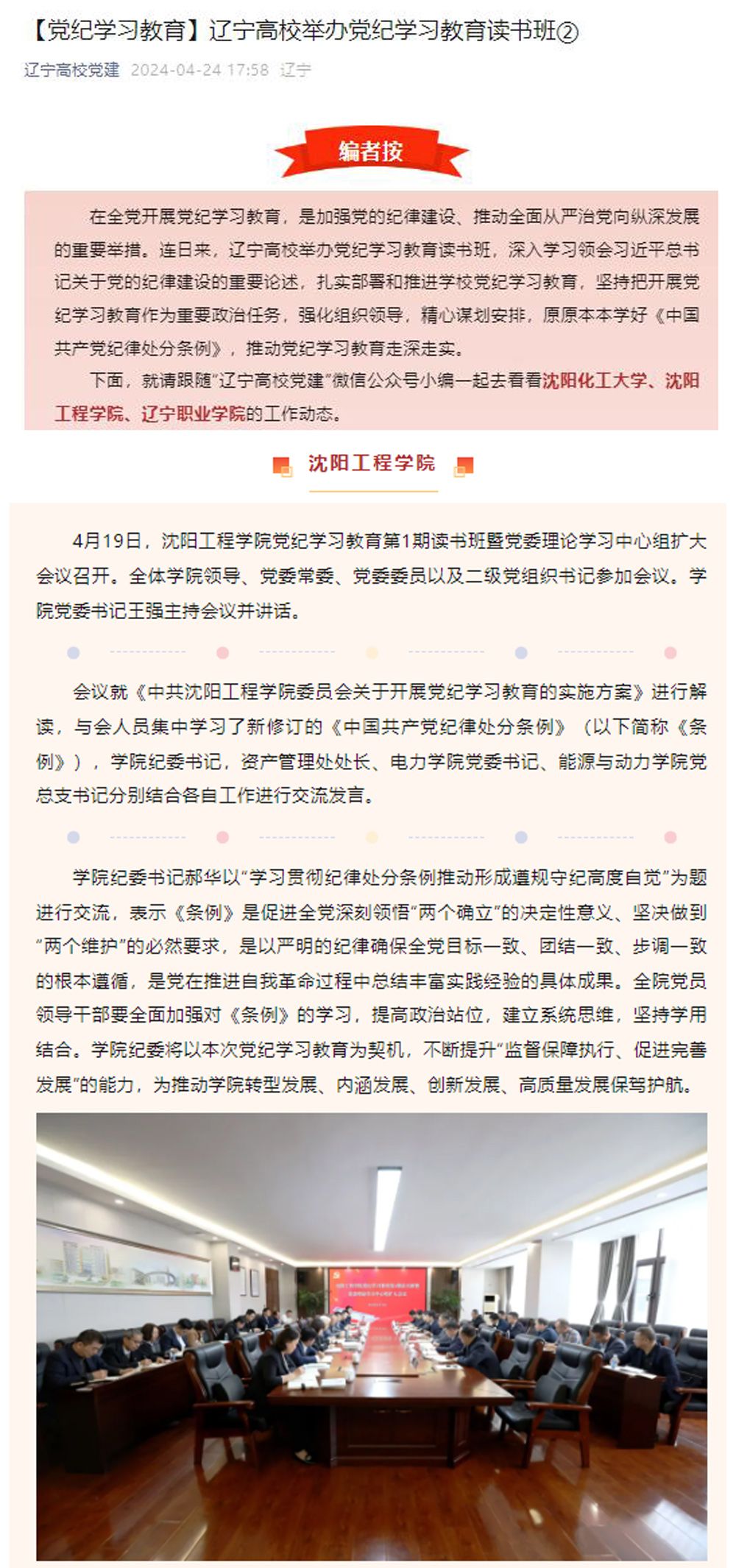 编者按:4月24日,辽宁高校党建以“辽宁高校举办党纪学习教育读书班②”为题,就包括我校在内的三家省属高校举办党纪学习教育读书班,深入学习领会习近平总书记关于党的纪律建设的重要论述,扎实部署和推进学校党纪学习教育,坚持把开展党纪学习教育作为重要政治任务,强化组织领导,精心谋划安排,原原本本学好《中国共产党纪律处分条例》,推动党纪学习教育走深走实进行报道。现将报道原文转载如下: