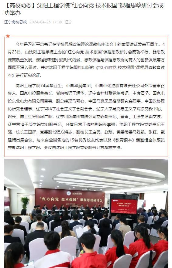 编者按:4月25日,辽宁高校思政以“bat365中文官方网站‘红心向党 技术报国’课程思政研讨会成功举办”为题,就我校值习近平总书记在学校思想政治理论课教师座谈会上的重要讲话发表五周年之际举行“红心向党 技术报国”课程思政研讨会,就思政课高质量发展、课程思政建设的时代内涵、思政课程与课程思政协同育人的创新发展等方面展开深入研讨,并对bat365中文官方网站即将出版的《“红心向党 技术报国”课程思政教育读本》进行研究论证一事进行专题报道。现将报道原文转载如下:
