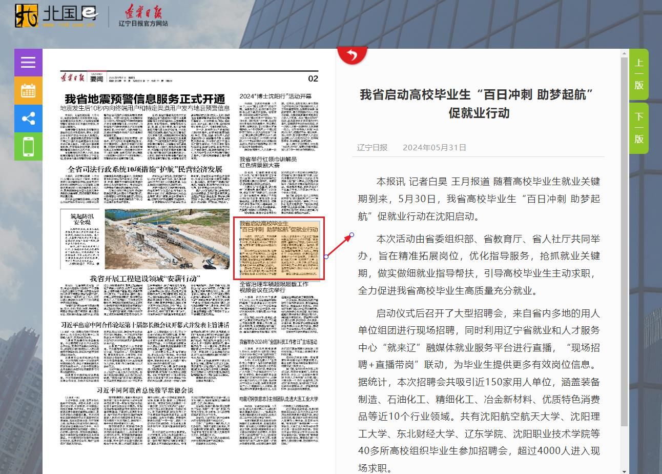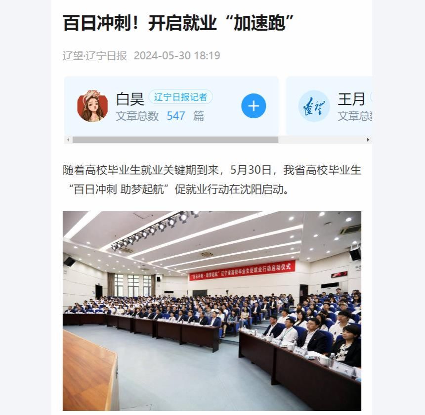 编者按:5月30日,辽望·辽宁日报、辽宁新闻、辽宁日报2版、东北新闻网等主流媒体 纷纷就由省委组织部、省教育厅、省人社厅共同举办,我校承办的辽宁省高校毕业生“百日冲刺 助梦起航”促就业行动,精准拓展岗位,优化指导服务,抢抓就业关键期,做实做细就业指导帮扶,引导高校毕业生主动求职,全力促进我省高校毕业生高质量充分就业一事进行专题报道。现将报道原文转载如下: