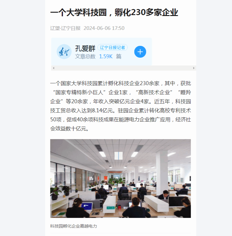 编者按:6月6日,辽望·辽宁日报以“一个大学科技园,孵化230多家企业”为题,就我校国家大学科技园累计孵化科技企业230余家,其中,获批“国家专精特新小巨人”企业1家,“高新技术企业”“瞪羚企业”等20余家,年收入突破亿元企业4家。近五年,科技园技工贸总收入达到8.14亿元。驻园企业累计转化高校专利技术50项,促成40余项科技成果在能源电力企业推广应用,经济社会效益数十亿元进行了专题报道。现将报道原文转载如下。