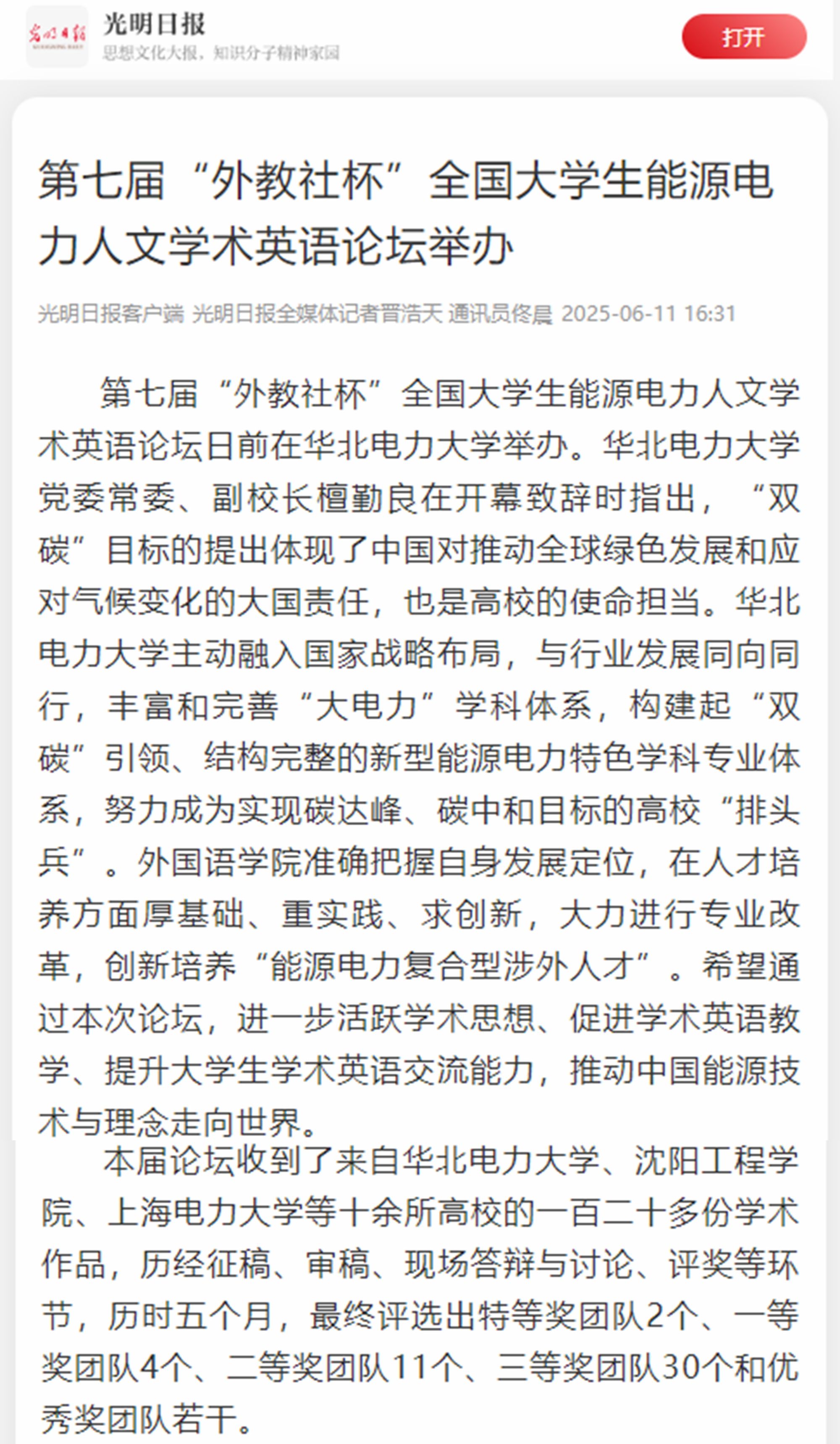 光明日报:第七届“外教社杯”全国大学生能源电力人文学术英语论坛举办