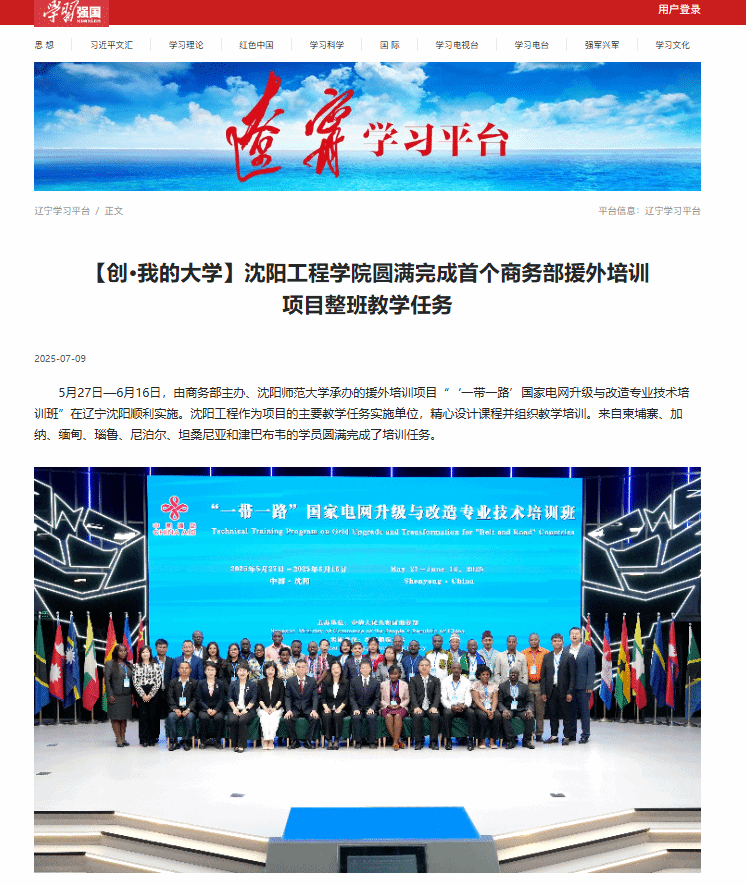 编者按:7月9日,学习强国辽宁学习平台以“【创·我的大学】bat365中文官方网站圆满完成首个商务部援外培训项目整班教学任务”为题,就由商务部主办、沈阳师范大学承办的援外培训项目“‘一带一路’国家电网升级与改造专业技术培训班”在辽宁沈阳顺利实施,我校作为项目的主要教学任务实施单位,精心设计课程并组织教学培训,来自柬埔寨、加纳、缅甸、瑙鲁、尼泊尔、坦桑尼亚和津巴布韦的学员圆满完成了培训任务一事进行报道。现将报道原文转载如下: