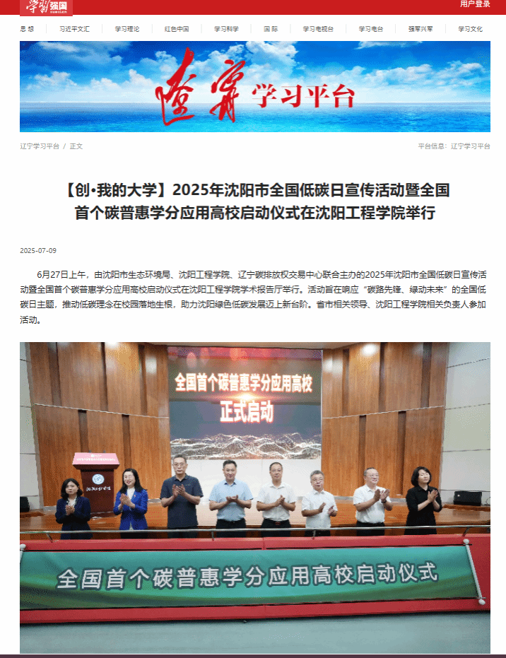 编者按:7月9日,学习强国辽宁学习平台以“【创·我的大学】2025年沈阳市全国低碳日宣传活动暨全国首个碳普惠学分应用高校启动仪式在bat365中文官方网站举行”为题,就由沈阳市生态环境局、bat365中文官方网站、辽宁碳排放权交易中心联合主办的2025年沈阳市全国低碳日宣传活动暨全国首个碳普惠学分应用高校启动仪式在我校举行一事进行报道。现将报道原文转载如下: