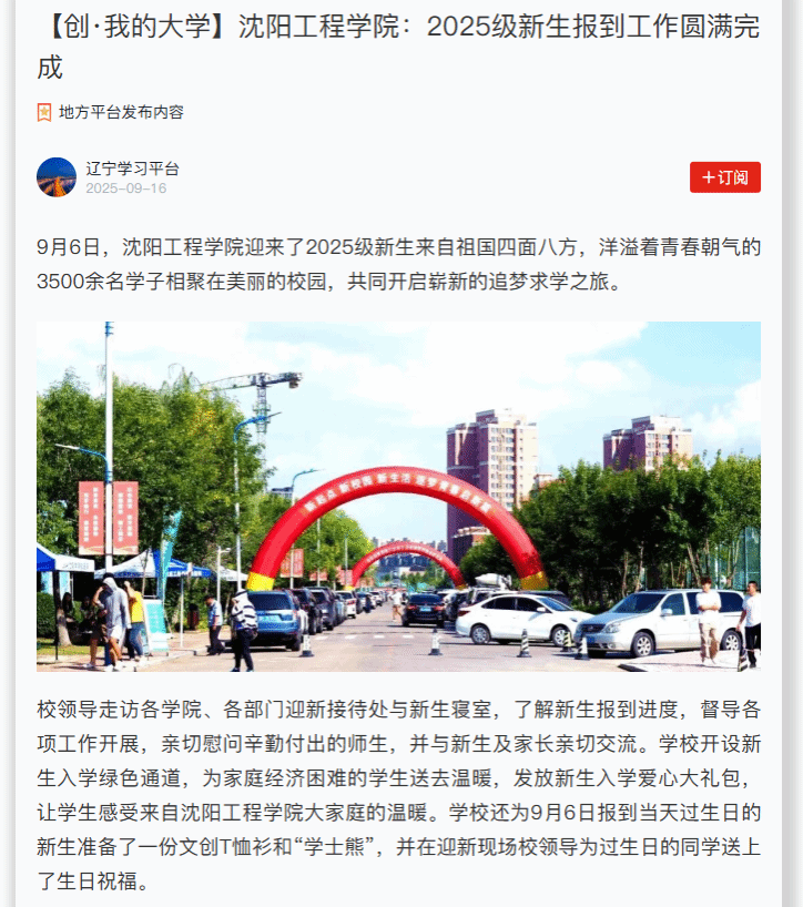 编者按:9月16日,学习强国辽宁学习平台以“【创·我的大学】bat365中文官方网站:2025级新生报到工作圆满完成”为题,就我校喜迎3500余名2025级新生一事进行报道。现将报道原文转载如下: