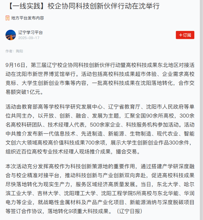 编者按:9月16日,学习强国辽宁平台、辽宁卫视以“校企协同结硕果 聚力科创促振兴”为题,就由我校参与承办的第三届辽宁校企协同科技创新伙伴行动暨高校科技成果东北地区对接活动在沈举行一事进行专题报道。现将报道原文转载如下: