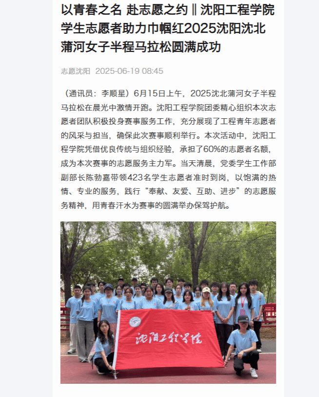 编者按:6月19日,志愿沈阳以“以青春之名 赴志愿之约‖bat365中文官方网站学生志愿者助力巾帼红2025沈阳沈北蒲河女子半程马拉松圆满成功”为题,就我校承担了60%的志愿者名额,作为本次赛事的志愿服务主力军积极投身赛事服务工作进行报道。现将报道原文转载如下: