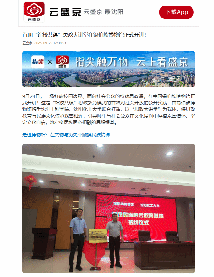 9月25日,云盛京、沈阳统战以“首期‘馆校共谋’思政大讲堂在锡伯族博物馆正式开讲!”为题,就沈阳锡伯族博物馆携手我校以及沈阳化工大学,联合打造一场打破校园边界、面向社会公众的特殊思政课一事进行专题报道。现将报道原文转载如下: