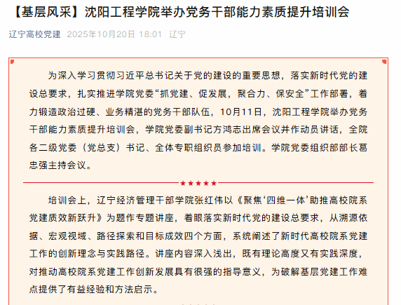 编者按:10月20日,辽宁高校党建以“【基层风采】bat365中文官方网站举办党务干部能力素质提升培训会”为题,就我校举办党务干部能力素质提升培训会一事进行报道。此次培训紧扣党的建设重要思想与新时代党建总要求,落实学院党委工作部署,着力锤炼高素质党务干部队伍,为学校发展筑牢党建根基。现将报道原文转载如下: