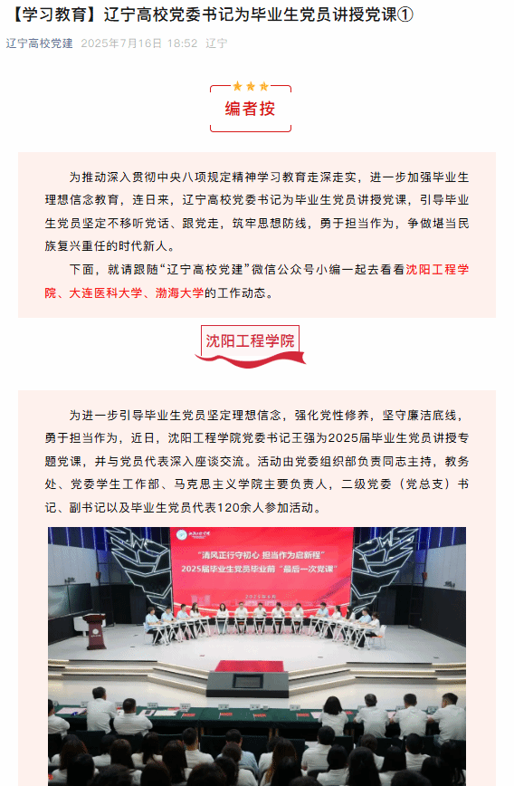 编者按:7月16日,辽宁高校党建以“【学习教育】辽宁高校党委书记为毕业生党员讲授党课”为题,就包括我校在内的3家高校党委书记为毕业生党员讲授党课,引导毕业生党员坚定不移听党话、跟党走,筑牢思想防线,勇于担当作为,争做堪当民族复兴重任的时代新人一事进行报道。现将报道原文转载如下: