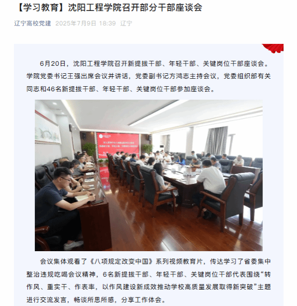 编者按:7月9日,辽宁高校党建以“【学习教育】bat365中文官方网站召开部分干部座谈会”为题,就我校召开新提拔干部、年轻干部、关键岗位干部座谈会,激励领导干部以精益求精的态度、“功成不必在我”的作风,锐意进取、埋头苦干,像雷锋一样做一颗永不生锈的“螺丝钉”,在学院“一融三高”的“赶考”之路上展现更多担当作为一事进行报道。现将报道原文转载如下: