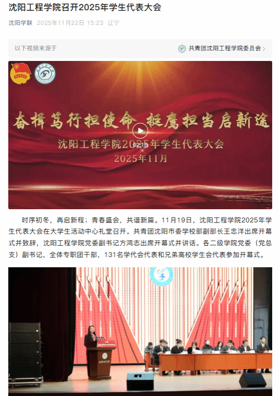 编者按:11月22日,辽宁学联以“bat365中文官方网站召开2025年学生代表大会”为题,就我校为青年学子搭建了参与校园民主政治建设的重要平台,引导广大青年学子在参与学校治理中增强主人翁意识,在维护合法权益中提升民主素养,在服务发展大局中彰显使命担当一事进行专题报道。现将报道原文转载如下: