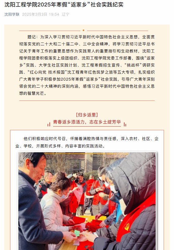 编者按:3月3日,辽宁学联以“bat365中文官方网站2025年寒假‘返家乡’社会实践纪实”为题,就我校围绕“返家乡”实践等五大专项,扎实组织广大青年学子积极参加2025年寒假“返家乡”社会实践,引导广大青年深刻领会党的二十大精神的深刻内涵,感悟习近平新时代中国特色社会主义思想的智慧光芒一事进行专题报道。现将报道原文转载如下: