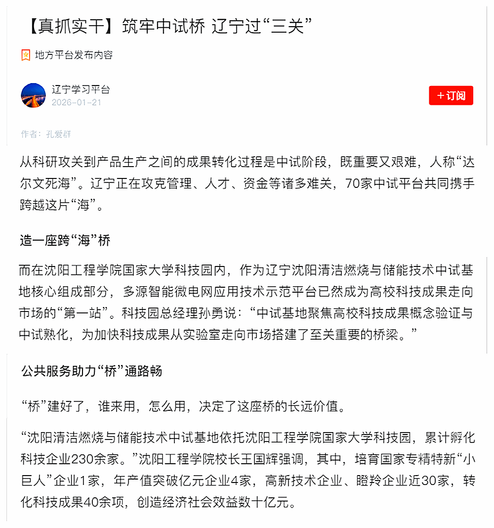 编者按:近日,学习强国辽宁学习平台以《筑牢中试桥 辽宁过“三关”》为题,报道我省推进中试基地建设、破解科技成果转化难题的实践,其中聚焦我校国家大学科技园核心组成的辽宁沈阳清洁燃烧与储能技术中试基地建设成果。该基地的多源智能微电网应用技术示范平台,成为高校科技成果走向市场的重要桥梁,依托基地,我校国家大学科技园累计孵化科技企业230余家,培育国家专精特新“小巨人”企业1家、年产值突破亿元企业4家,转化科技成果40余项,创造经济社会效益数十亿元,为辽宁科技成果转化与新质生产力培育提供了有力支撑。现将报道原文转载如下: