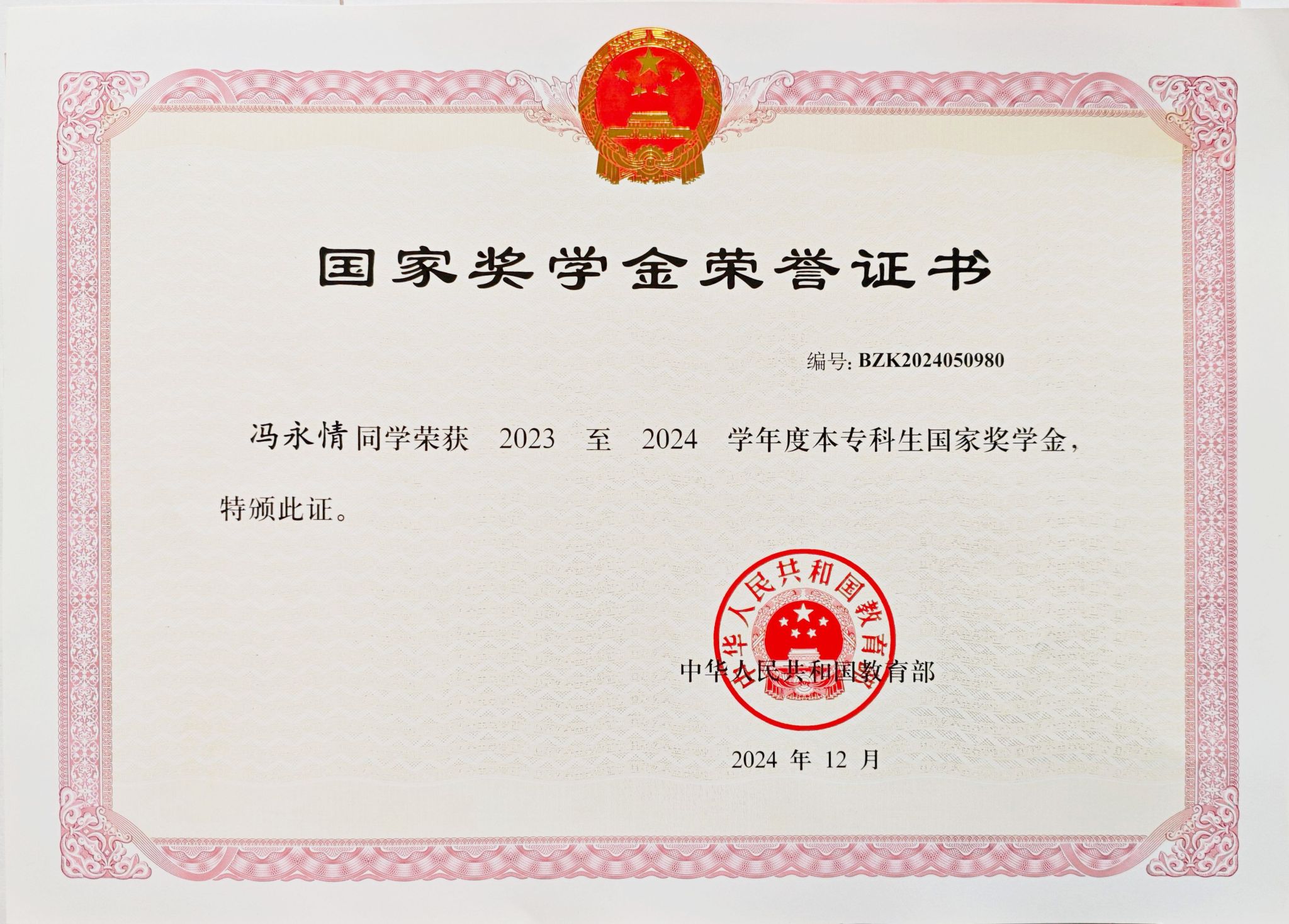 2023年退役复学后,冯永情延续部队的优良作风,严于律己,她将部队锻炼的意志力转化为学习的韧性,将军旅作风注入求学之路,在学业赛道上飞驰奋进,连续保持专业第一,获得国家奖学金、特等奖学金、单项奖学金等多项荣誉。她还参与中国物流协会课题等省市级项目,科研竞赛多次获奖。同时她积极参加校园活动,无私帮助同学。穿上军装,她守家卫国,把宝贵青春献给国防事业;脱下军装,她本色不变,在校园生活书写精彩篇章。