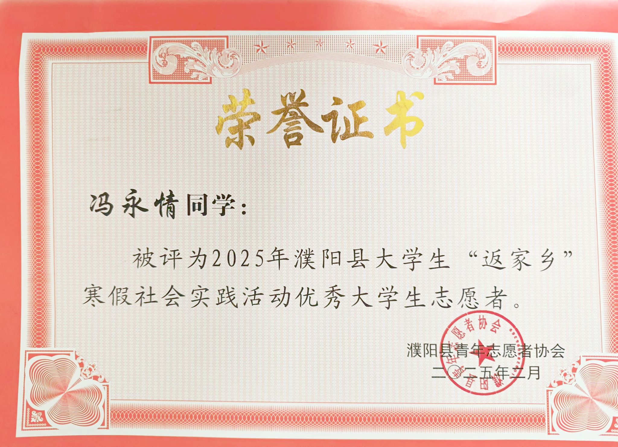 冯永情积极投身公益活动,寒假期间加入了濮阳县团委“晨曦”大学生志愿队和濮阳县文旅推广群,并担任起了志愿服务队的队长。她在田间地头解读政策文件,在镇政府整理档案,从事政务实践服务。在乡村街道宣传环保,提升民众环保意识。参加青少年心理健康服务进社区活动,鼓励青少年进行自我探索与创意表达,宣传普及心理健康知识,树立正确的心理健康观念。她用实际行动在党和人民最需要的地方绽放青春。她用爱心传递着温暖,为社会进步贡献自己的力量,累计志愿时长300余小时,连续3年获得校“社会实践先进个人”荣誉称号。