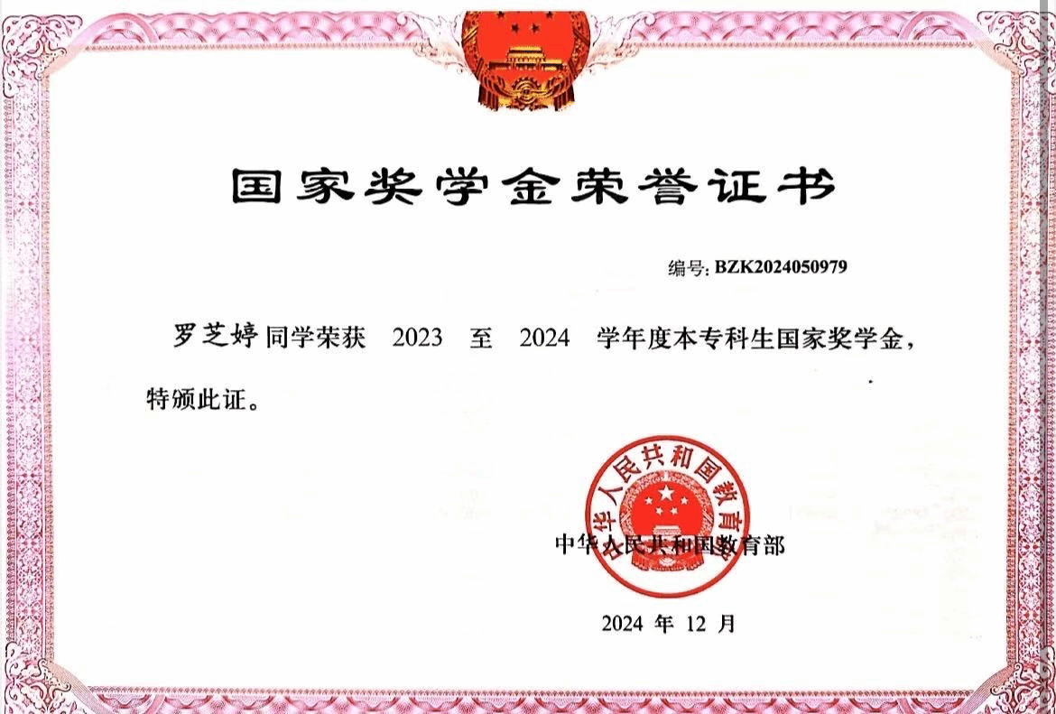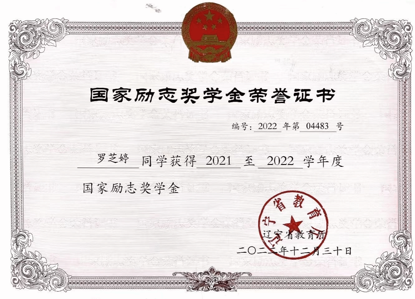 凭借优异学业表现,她两度荣获国家励志奖学金与校特等奖学金,并最终斩获2024年度国家奖学金。这份殊荣,是对其勤学与韧劲的认可。毕业之际,她入选辽宁省优秀毕业生。每一份荣光,都是她超越自我、追求卓越的坚实足迹,也为同窗点亮了砥砺前行的灯火。